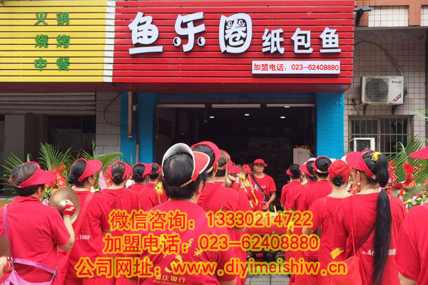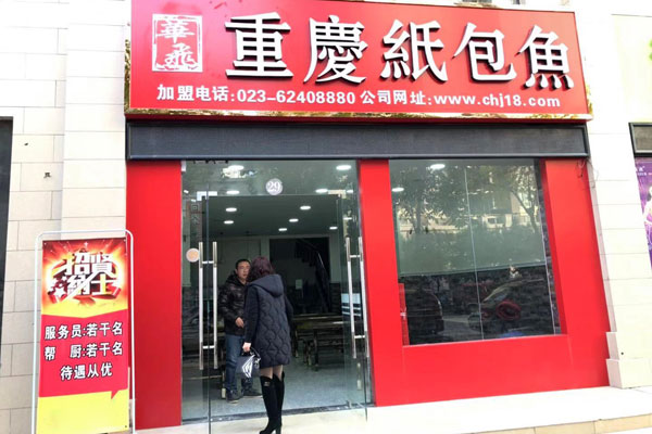 重庆餐饮加盟总部旗下张先生的重庆市荣昌区纸包鱼加盟店门口招牌展示一,祝贺张先生的纸包鱼加..[详细]