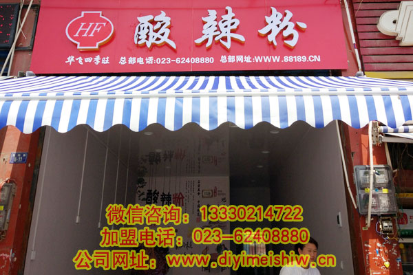 重庆餐饮加盟总部旗下王先生的河南省三门峡市重庆酸辣粉加盟店门口招牌展示一,华飞餐饮总部祝..[详细]