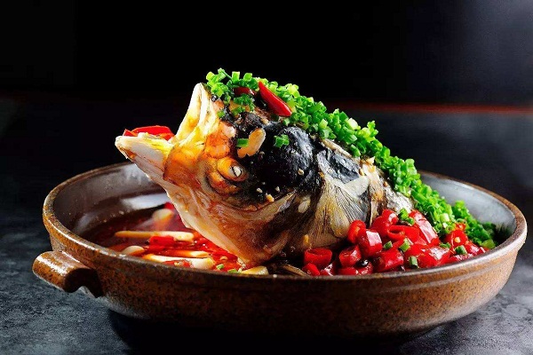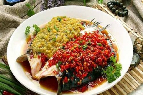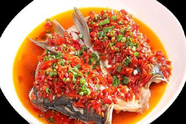 剁椒鱼头是湖南省的传统名菜,属于湘菜系。通常以鳙鱼鱼头、剁椒为主料,配以豉油、姜、葱、蒜等辅料蒸制而成。菜品色泽红亮、味浓、肉质细嫩。肥而不腻、口感软糯、鲜辣适口,以鱼头的“味鲜”和剁椒的“辣”为一体。火辣辣的红剁椒,覆盖着白嫩嫩的鱼头肉,冒着热腾腾清香四溢的香气。蒸制的方法,鱼头的鲜香被尽量保留在肉质之内,剁椒的味道又恰到好处地渗入到鱼肉当中,入口细嫩晶莹,带着一股温文尔雅的辣味。