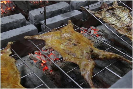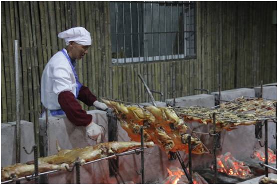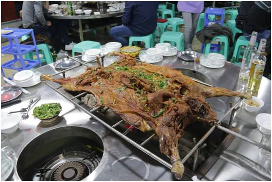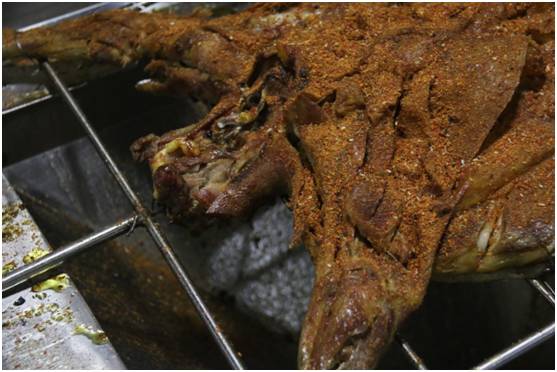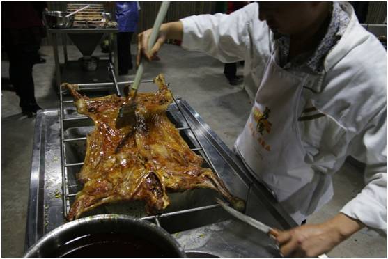 主厨师傅告诉我这里是的羊都是点杀放养的黑山羊,没有添加剂是基本,更重要的是肉质可以得到保证。在烧烤的过程中可以看到羊肉色泽的变化。等待是值得的,可以看得出是越来越诱人了。老板表示长时间是为了保证烤全羊的肉质。也是为了保证健康,所以不采取明火烧烤的方式。