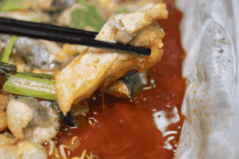 放入些青菜再拉上几片烩面,吃起来就一个字“爽”!