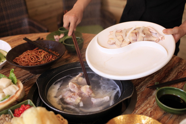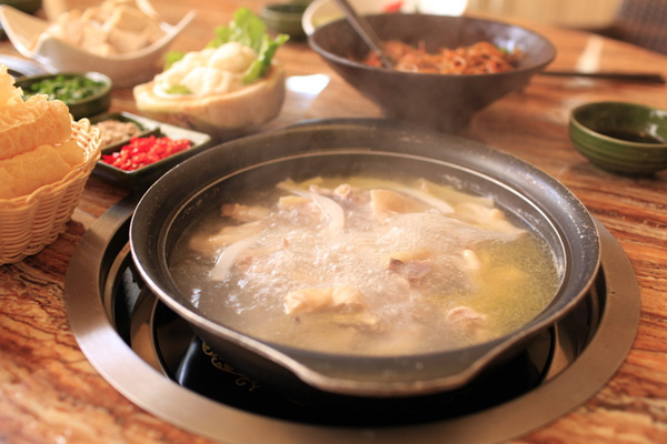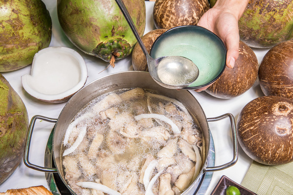 椰子鸡火锅是用椰子、文昌鸡制作的一道色香味俱全的汉族名肴,属于海南菜。口味咸鲜,椰味芬芳,汤清爽口。在吃椰子鸡火锅的时候把小金桔汁挤在酱油里提鲜,再按自己口味加入沙姜和红椒圈,这样的调味料是吃椰子鸡火锅的最完美搭配。