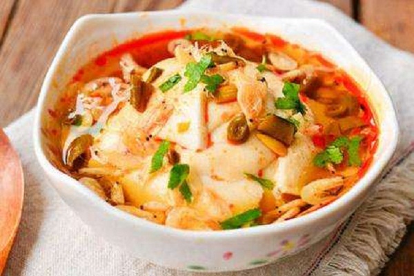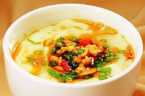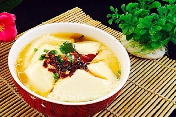 豆腐花,一道着名的特色传统小吃。豆腐花是一种用黄豆制作的小吃,个别的会用豌豆、蚕豆等豆类制作。 将黄豆用水泡涨,磨碎过滤出豆浆,豆浆如果加入盐卤或石膏,就会凝结成非常稀软的固体。豆腐花制作须先将黄豆浸泡,依品种或个人喜好约48小时不等,俟黄豆吸饱水分后再加以打浆、滤渣、煮滚,复降温至90℃。最后步骤称为“冲豆花”,意即需冲入凝固剂豆浆后再静置515分钟才能完成。而豆花美味的技巧就出于豆浆与凝固剂融合的温度控制,以及冲豆花的速度与技巧。
