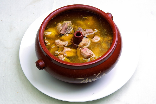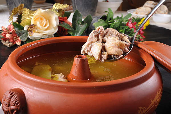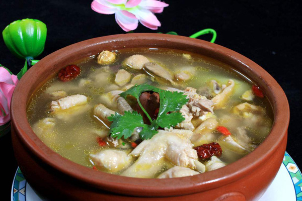 汽锅鸡是云南的名菜之一,因用汽锅蒸制而得名,早在2000多年前就在滇南民间流传,因为其营养丰富深受广大群众的喜爱。汽锅鸡的主要食材是鸡肉,主要烹饪工艺是蒸,做法是将仔鸡洗净后砍成小块,和姜、盐、葱、草果一道放入汽锅内盖好,汽锅置于一放满水的汤锅之上,用纱布将隙缝堵上,以免漏汽,再放到火上煮。汤锅的水开后,蒸汽就通过汽锅中间的汽嘴将鸡逐渐蒸熟(一般需3 ~4小时)。由于汤汁是蒸汽凝成,鸡肉的鲜味在蒸的过程中丧失较少,所以基本上保持了鸡的原汁原味。