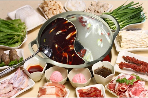 鸳鸯火锅,是一道美味可口的名吃,属于渝派川菜系。成菜风味别致,麻辣鲜香,鲜醇浓厚,各有特色。鸳鸯火锅,是以传统毛肚火锅的红汤卤和宴席菊花火锅的清汤卤,两者合并改制而成的重庆创新火锅。此品原名“双味火锅”。这种火锅用铜片隔成两半,造成一个太极图形,一边放清汤卤,一边放红汤卤,入锅烫涮的原料可随人意。它巧妙地将重庆传统的红汤火锅和清汤火锅汇于一锅,风味别致,颇有特色。更可取的是这个菜的容器,这种太极图锅耐人寻味。