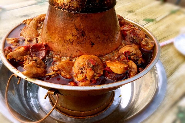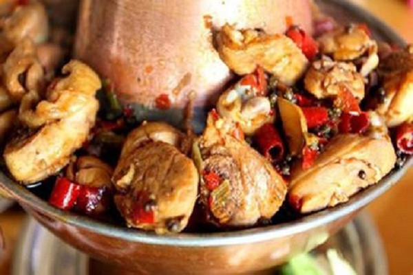 火锅鸡是一种美食,主要材料有白条鸡、豆瓣酱等,辅料有麻椒、辣椒、豆瓣酱、食盐、白糖、肉蔻、白芷、三艾等,口味偏麻辣,起源于河北沧州。在沧州走几步就有一家火锅鸡店,火爆程度非其他火锅可以媲美,沧州普通家庭几乎都会制作,是亲朋聚会时不可或缺的一道菜肴。食川沧州麻辣火锅鸡为主要代表,现在又传至京津地区乃至全国各地。食用时配以陈醋蒜泥等辅料,味香浓郁,回味无比。