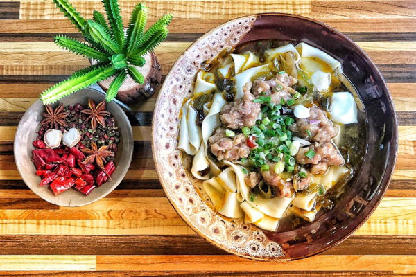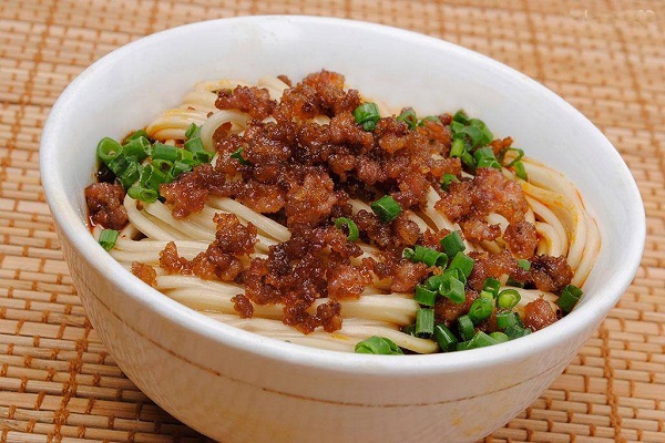 担担面是四川成都和自贡着名的地方传统面食小吃,据说源于挑夫们在街头挑着担担卖面,因而得名。担担面是将面粉擀制成面条,煮熟,舀上炒制的肉末而成。成菜面条细薄,卤汁酥香,咸鲜微辣,香气扑鼻,十分入味。担担面是四川小吃中的代表性食物,为人们品尝四川小吃时的必备佳肴。如今担担面已遍布各地,虽做法有些许不同,但因其美味受到各地人民的喜爱,已成为一种家常美食小吃。