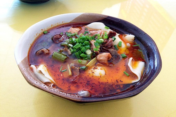 铺盖面是重庆荣昌区的一种特色面食。通常是在揉着比较硬的面团上,通过两只手掌的夹、扯等动作,从面团上拽下巴掌大小的面片,稍微拉扯均匀后下锅煮熟即可出锅。出锅后,配以传统的麻辣牛肉汤或者鸡杂汤等,口感有肉感而不硬,下肚后浑身热乎乎的,冬天或者雨天吃上一碗铺盖面,整个人从里到外都散发的暖意。