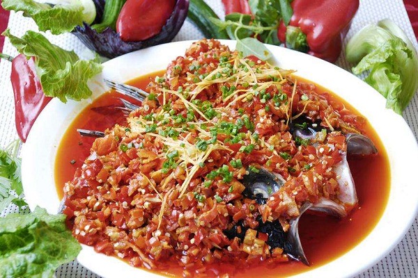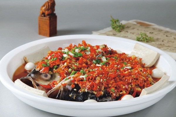 剁椒鱼头是湖南省的传统名菜,属于湘菜系。通常以鳙鱼鱼头、剁椒为主料,配以豉油、姜、葱、蒜等辅料蒸制而成。菜品色泽红亮、味浓、肉质细嫩。肥而不腻、口感软糯、鲜辣适口,以鱼头的“味鲜”和剁椒的“辣”为一体。火辣辣的红剁椒,覆盖着白嫩嫩的鱼头肉,冒着热腾腾清香四溢的香气。蒸制的方法,鱼头的鲜香被尽量保留在肉质之内,剁椒的味道又恰到好处地渗入到鱼肉当中,入口细嫩晶莹,带着一股温文尔雅的辣味。