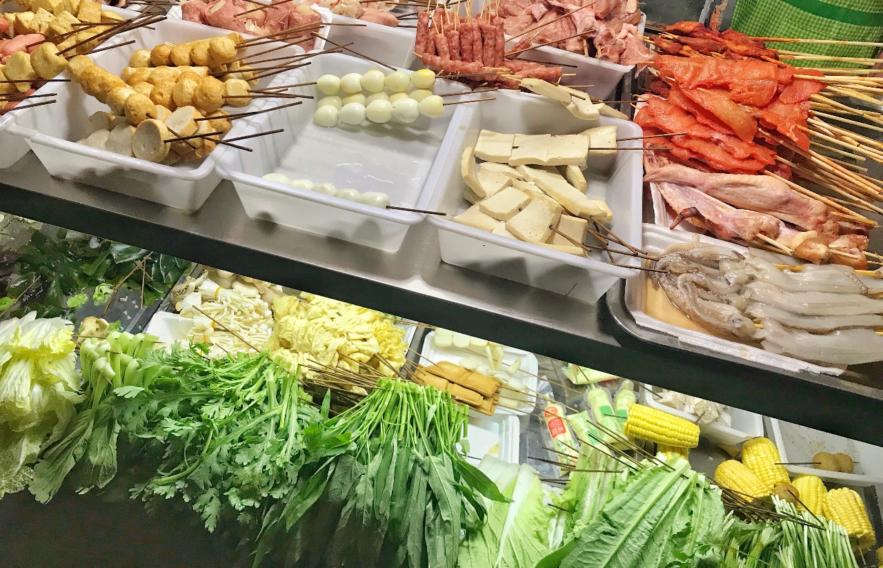 不同于其他商家在汤汁上大做文章,厦门的麻辣烫索性抛弃了汤底这一元素,煮过的蔬菜和油炸好的荤菜沥干装盘,花生酱是唯一的调料,对比之下是食材的丰盛:串好的翅中、米血、白果、鸭胗一应俱全,可随时下锅。