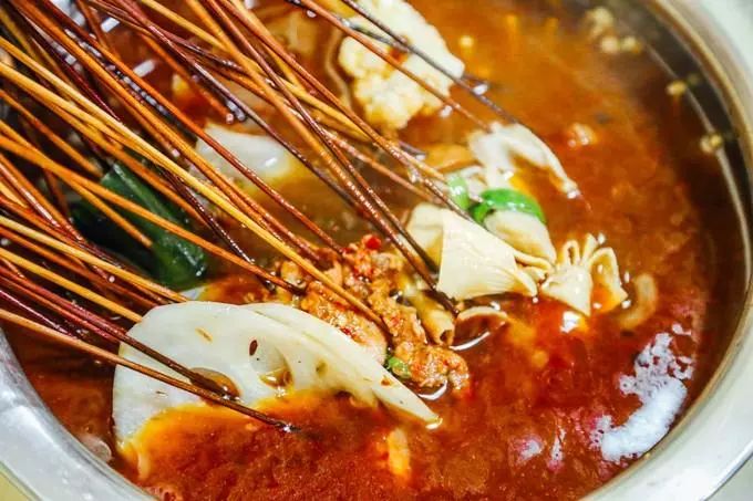 贴士:同样是一串串的,很多人分不清串串和钵钵鸡的区别。其实,前者是生的食材在口味调配好的热汤中煮熟,后者是食材事先煮熟再浸泡在汤料中。
