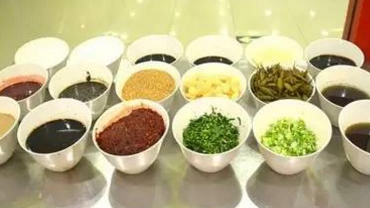 美味丰富回转火锅的运输带上的火锅食材多样各式的酱料