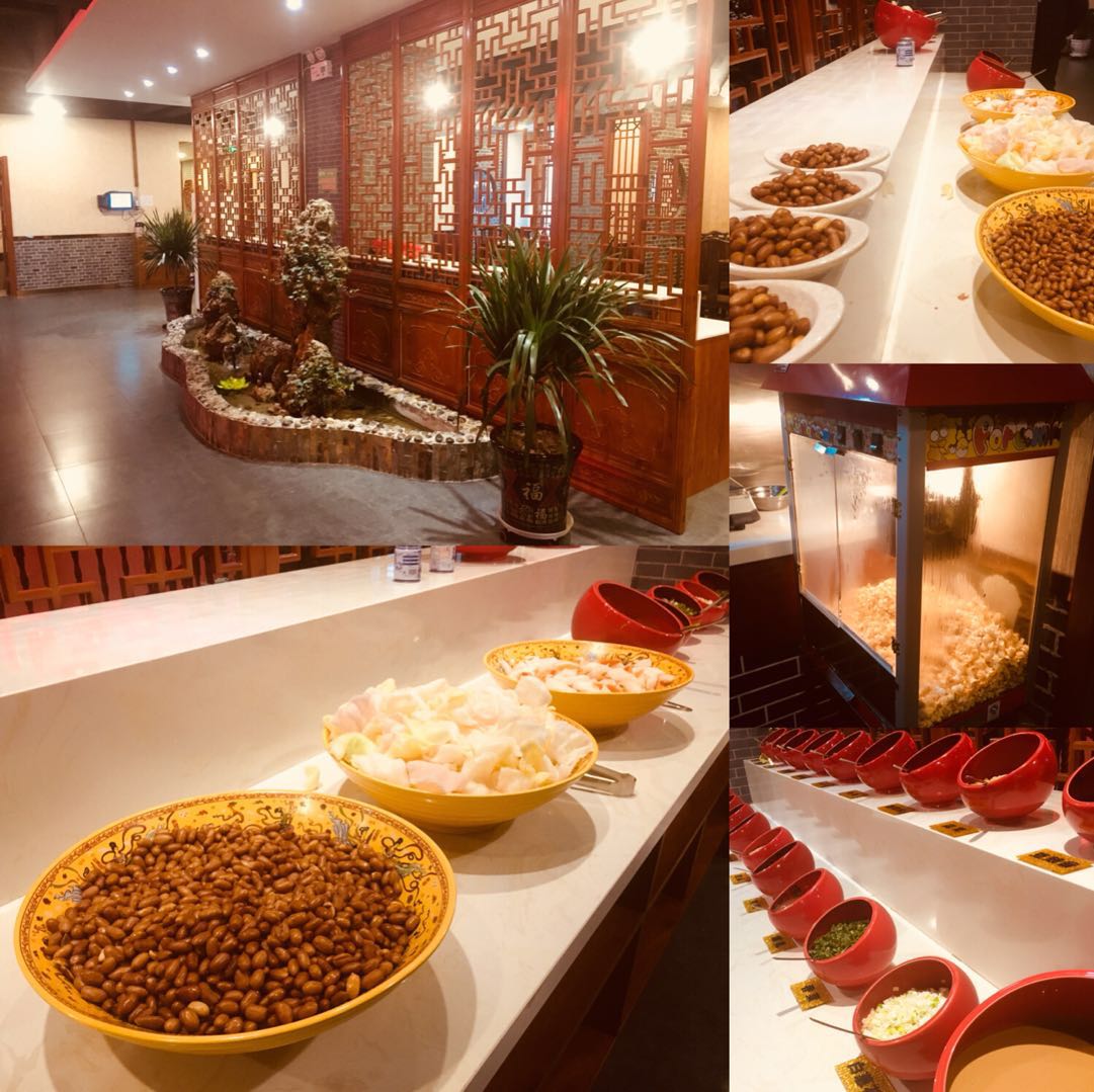 一楼大厅略过,直奔二楼,扑面而来的实木风格令人惊艳,巨大的屏风后面一边是自助小料,另一边是免费小菜,旁边角落里还有如今火锅店的标配:爆米花机。