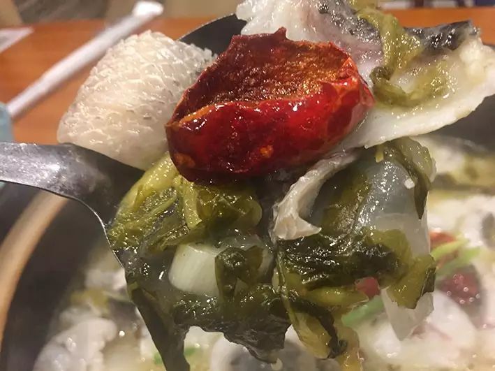 吃到最后,锅底干净,除了酸菜鱼,还发现了如纸薄的酸萝卜片,不得不说厨师刀功真不错!