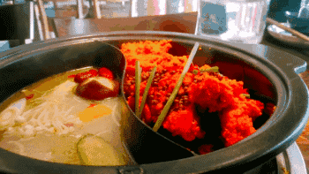 旁边的牛油加汤后也跃跃欲试。但是牛油的分量和味道并不是特别的霸道,一种淡而不寡的、刚刚好的感觉,没有太油,没有太辣,没有太麻,适合那些不是特别能适应重口味的朋友们尝试。