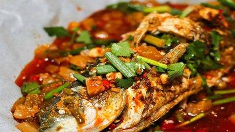 鲜美活鱼,加上葱、姜、蒜等一百多种特制配料