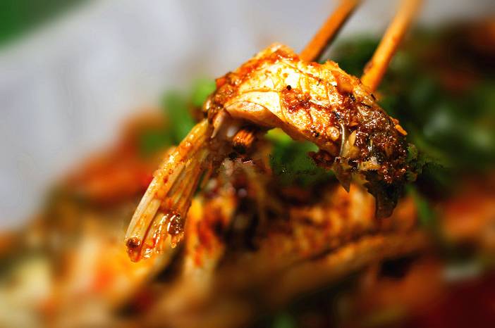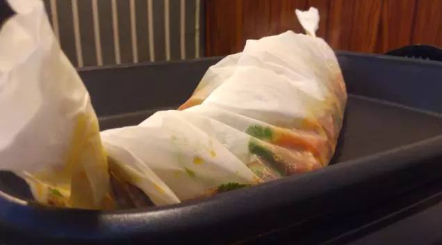店家的鱼是现点现杀的,处理干净以后直接包裹上烤纸和佐料拿上桌来。小编上次去选择的是蒜香加泡椒口味的草鱼,一条大概2斤半左右,是两三个人吃的量。透过半透明的烤纸,隐隐约约的能看见满满的酱料和香菜,令人胃口大开。