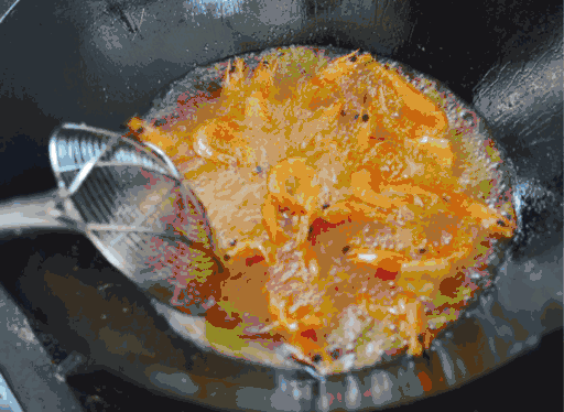 洗净、去虾线后加入热油中煎炸