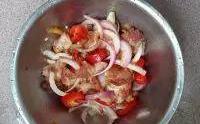 7.关掉上盘开关。打开放入洋葱和红椒。盖上盖子再烤至熟透即可。