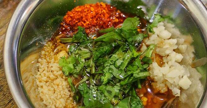香菜、花生碎、蒜泥和辣椒,在清汤的帮助下调和均匀,一个人能来两碟!