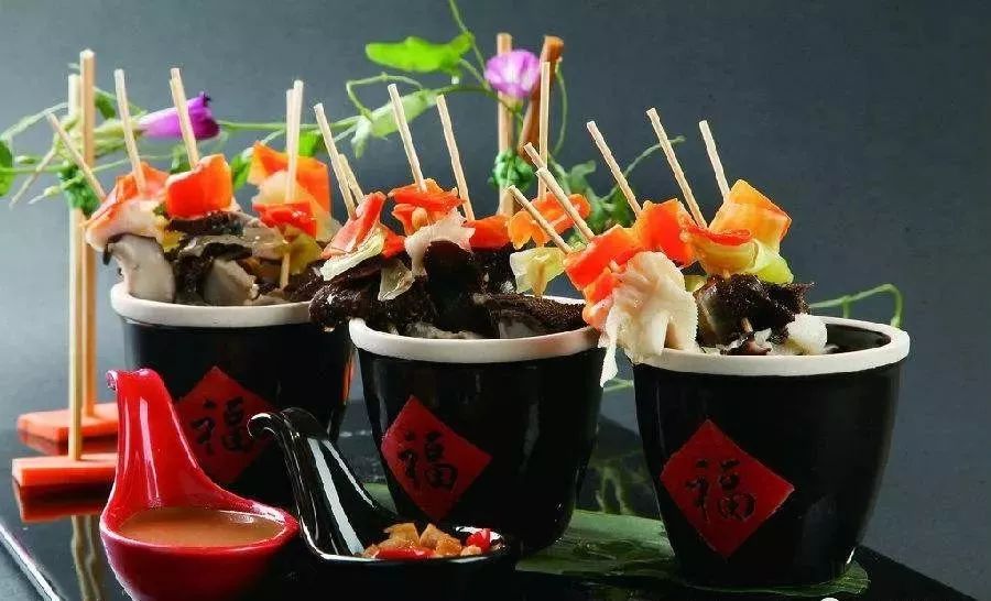 制主料。将劳菜洗净、兔腰、鳝鱼、鸭肠切成2厘米长宽的方块;毛肚、猪环喉切成4厘米左右见方。牛餐肉切成4厘 米左右见方的薄片菜切成3厘米左右的薄片。用洗净的竹签,将肴穿成约三四十克一串。
