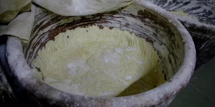 老板娘告诉我,现在用酵母发的面不用揉,做出来的饼和馒头没有面味。所以他们坚持用老面发面,经过人工的揉面加上面碱,老汉一个人一气呵成,再循环往复,一天要做掉100公斤面粉。使现在烧饼店一天可以产出1400多个烧饼,老汉说他一家门店从早晨四点起开始发面,一天要发酵四缸面,每天都是忙忙碌碌,但是格外的充实。