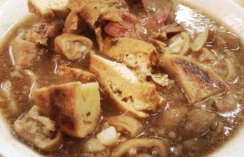 卤煮火烧是北京传统特色小吃,起源于北京城南的南横街。据说光绪年间因为用五花肉煮制的苏造肉价格昂贵,所以人们就用猪头肉和猪下水代替,经过民间烹饪高手的传播,久而久之,造就了卤煮火烧。