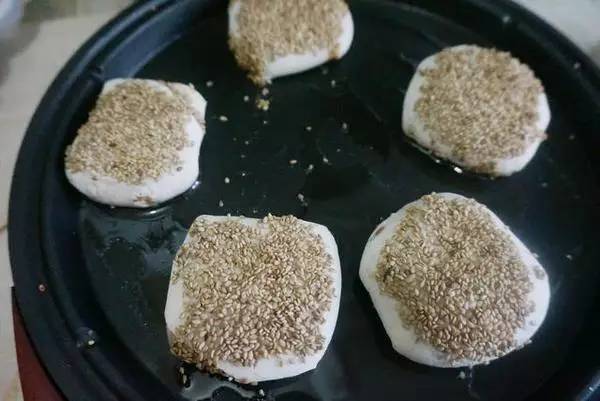 7.饼面抹匀清水,在盛芝麻的盘内粘匀芝麻。