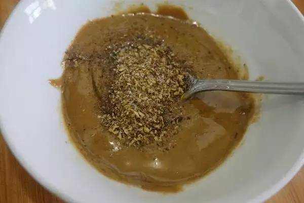 2.芝麻酱中加入适量的香油和1克盐懈成糊。状态是那种根据个人口味,加入椒盐,拌匀。